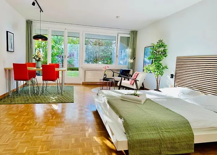 El New, Central Studio With Garden Terrace And Much Privacy Zúrich está situado a unos 5 minutos a pie de Club Mundwerk y a 5 km del aeropuerto Internacional de Zúrich. Los huéspedes seguramente se beneficiarán del Wi-Fi y del aparcamiento privado en el apartamento, situado en el barrio Norte de Zúrich de Zúrich.